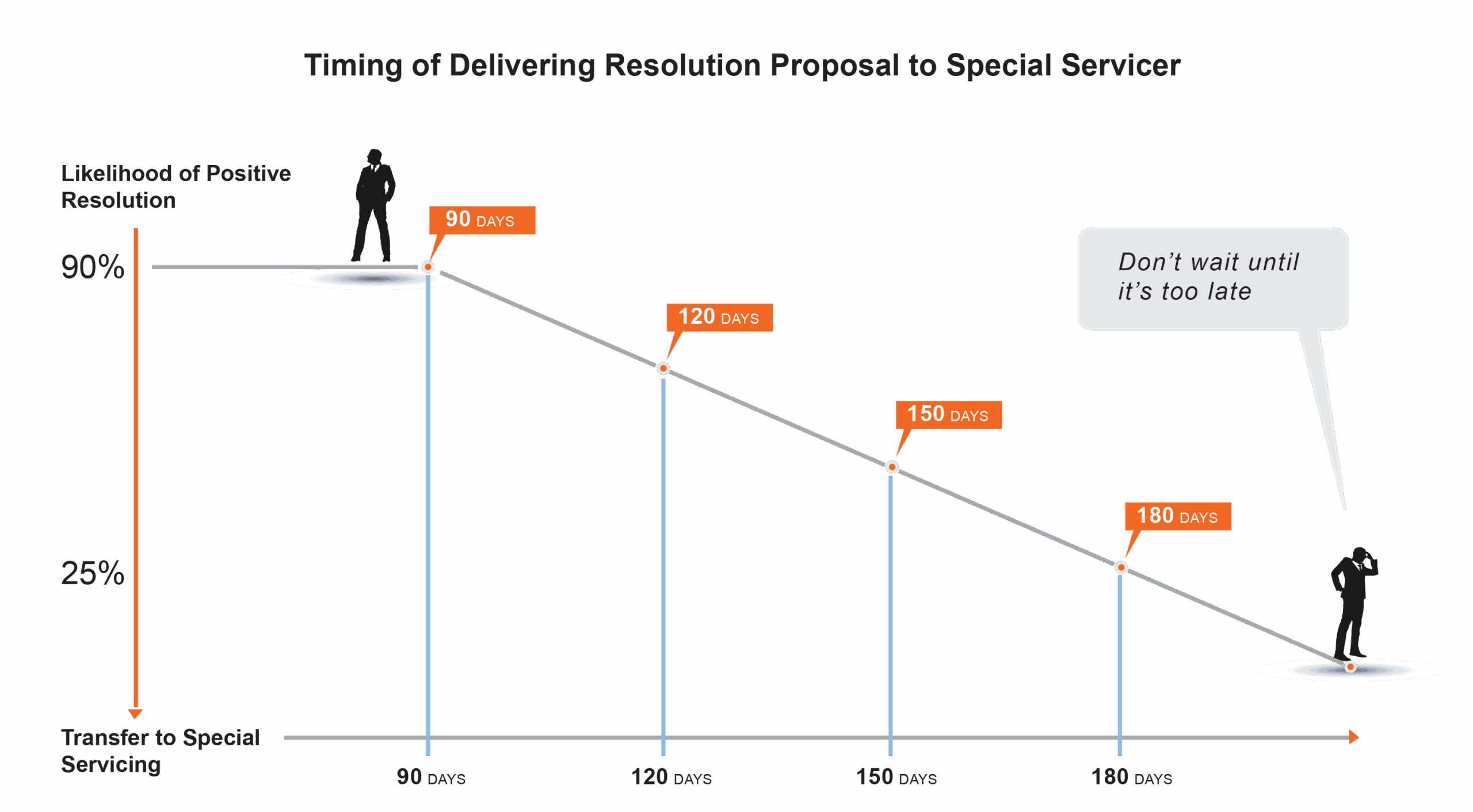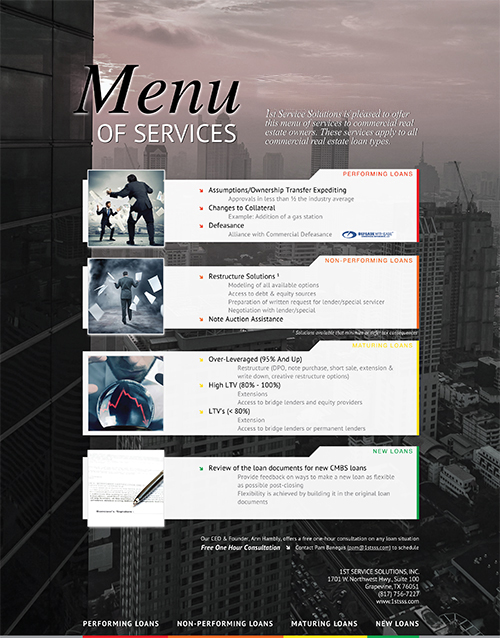 Most borrowers have little understanding of the responsibilities the servicers have. We have both the insight and the experience to help you navigate through the maze of bureaucracy that typifies a loan restructure with a special servicer. What sets 1st Service Solutions apart is that we understand that the restructure of debt is a servicing function. Based on our combined 100+ years of experience in the industry, we can help produce a positive outcome when we negotiate a loan restructure.